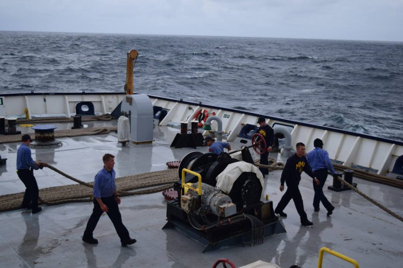 Despite several days of rougher seas and gradually cooling weather, morale remains high as we are due in Cobh, Ireland, our first international port tomorrow morning. We will spend four days in port, with each company receiving in-depth hands on training at the National Maritime College of Ireland, including the opportunity to ride in a free-fall lifeboat. Shipboard training is going as scheduled, with deck training providing the freshmen with a refresher on knot tying and line handling, and the engine side providing them with an overview of turbines and steering gear, as well as with some hands-on experience drilling and tapping holes in steel, and disassembling a gate valve to learn how it works.