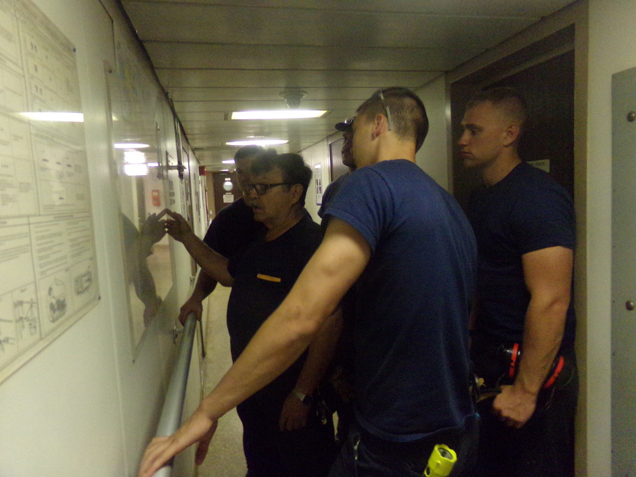 - The plumber and his gang examine plans of the ship during an engine maintenance session