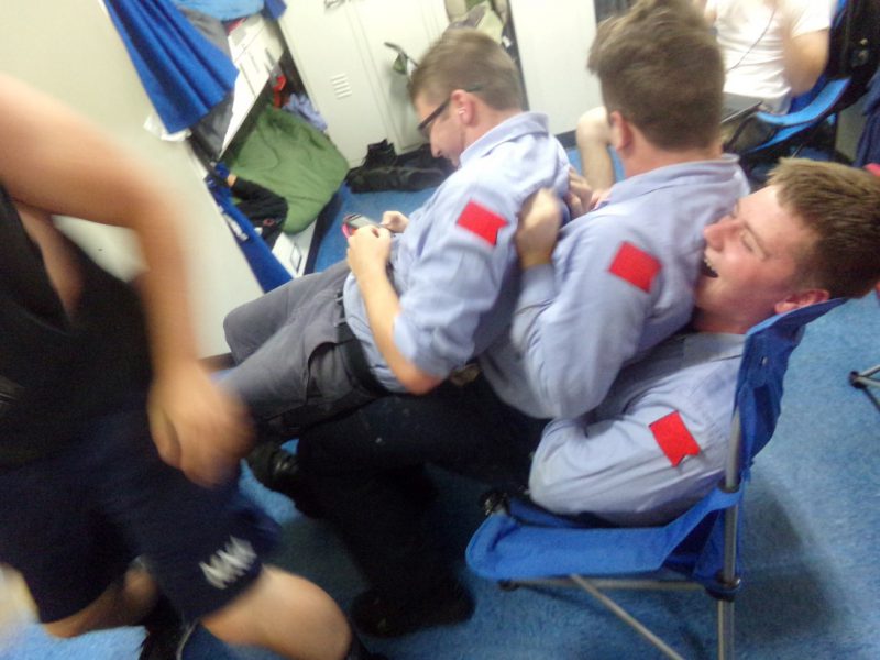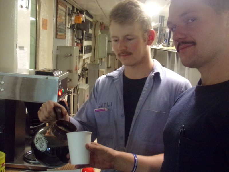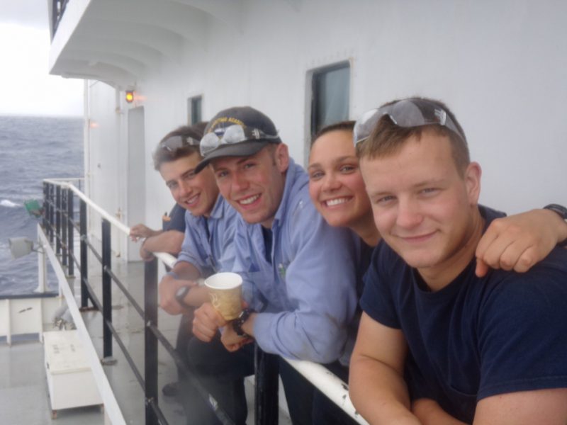 Midshipmen woke this morning to larger-than-usual seas and passing squalls, which have lessened in intensity through the day and ended in a beautiful evening, spent by many out on deck. Today also marked the final day of the first company rotation, with Alpha and Bravo swapping watch and utility duties, and Charlie taking up training and giving Delta Company maintenance duties for the next three days. Although we’re still a week out of Ireland, many students are already making plans for our first international port.