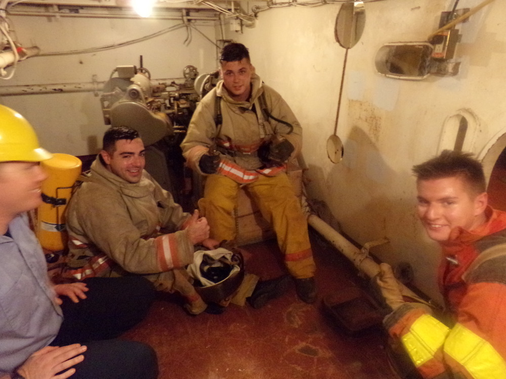 - 4/C Rust, Dragon, and Ellis debrief with Captain Potter after a search and rescue drill