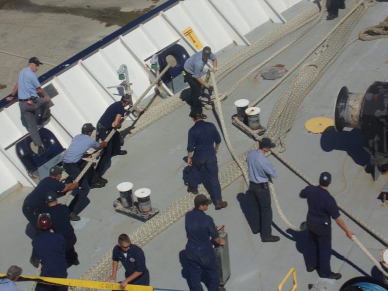- Charlie Company hauls in the mooring lines as we prepare to get underway