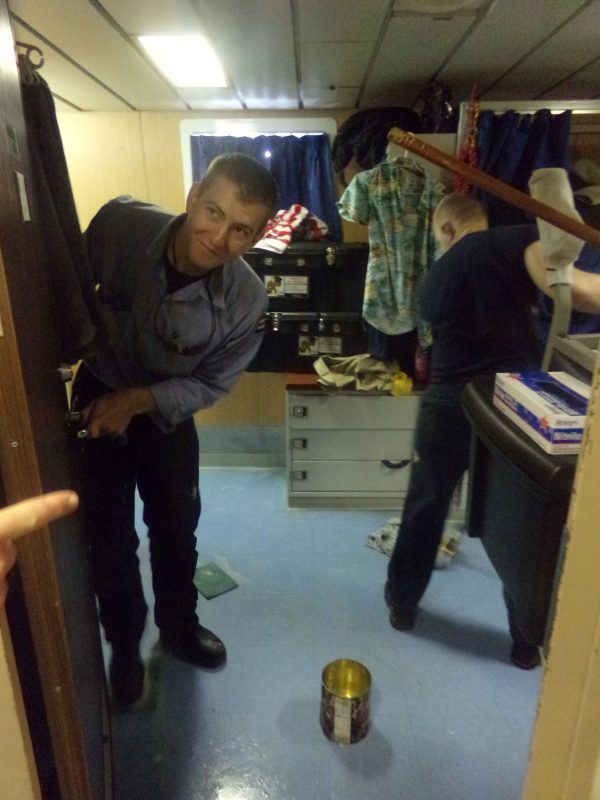 - 2/C Donlon and 4/C Nevins strip and wax the deck in preparation for a thorough inspection.