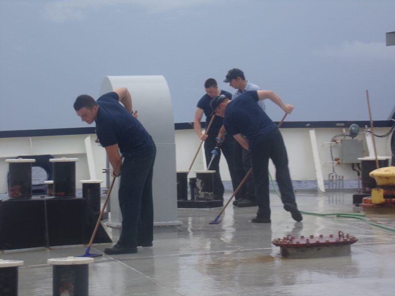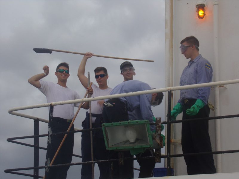 - Some very enthusiastic Cadets on deck maintenance, the rain will never bother these guys!