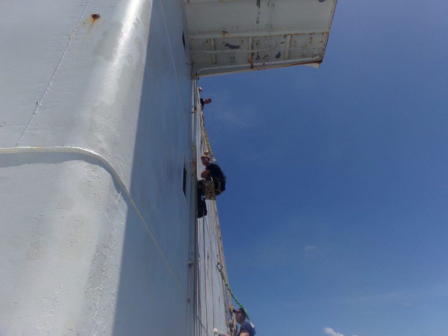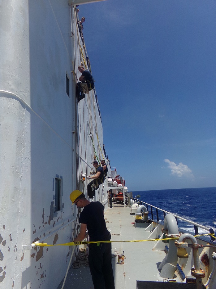 - Students work in boatswain’s chairs to prime the forward house.