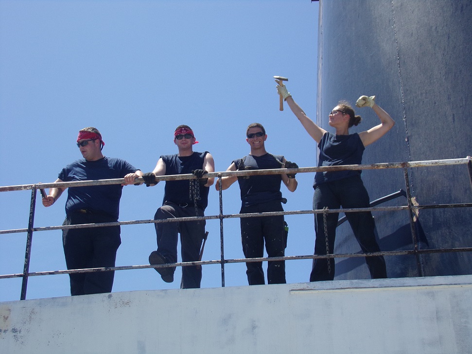 - Bravo 4/C and 2/C take a moment to pose for the camera while scraping paint on the 05 deck.