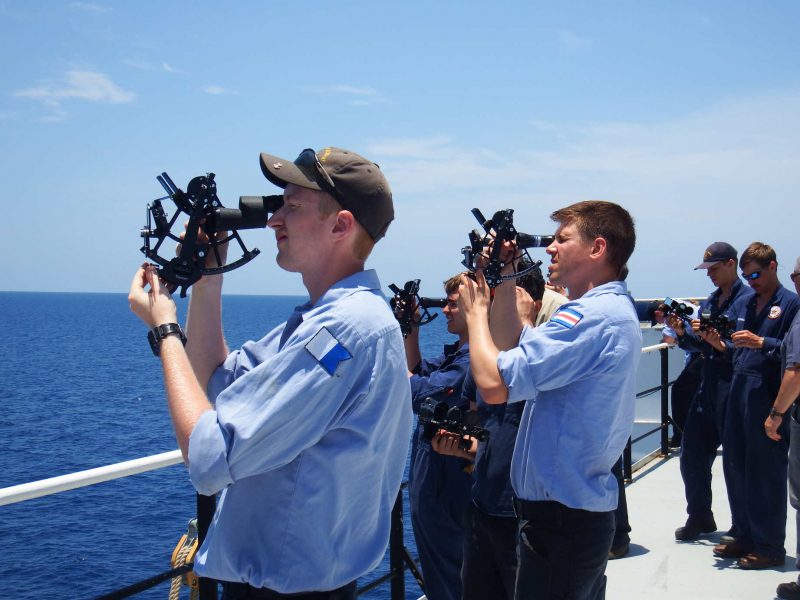 - 2/C Midshipmen practice celestial navigation using a sextant.