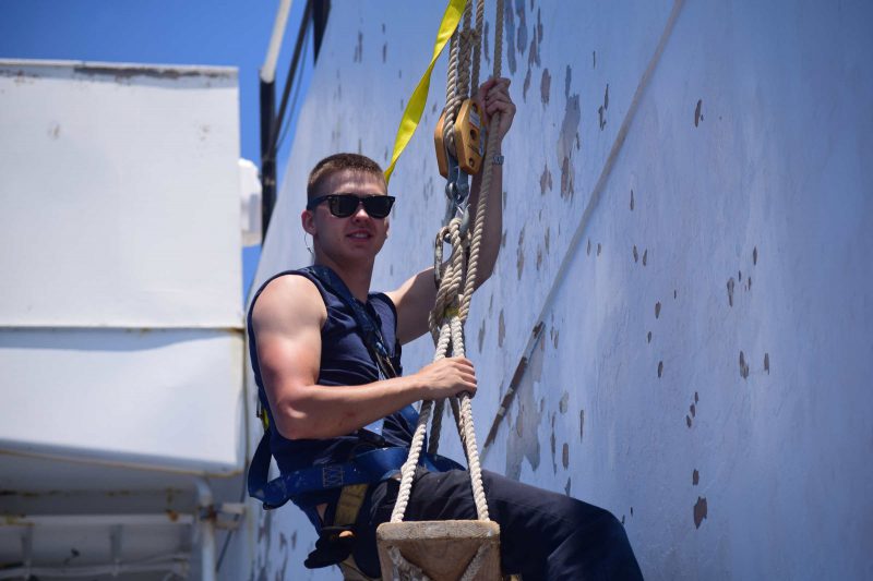 - 4/C Hallett scrapes paint aloft in a boatswain’s chair