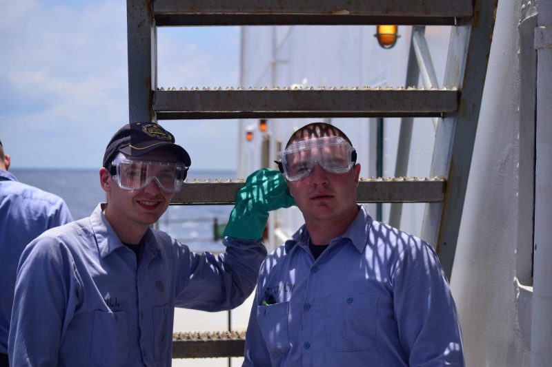 Today was another day much cooler than we’ve seen recently, making it ideal for working out on deck. The maintenance company has been touching up the deck on the starboard side, railings up on the 04 deck, and preparing the starboard side of the forward house for paint. Tonight marks the last day of the current company rotation, as Alpha shifts to maintenance, Bravo begins a utility session, Charlie assumes the watch at midnight, and Delta is first to take their first exams in both deck and engine training.