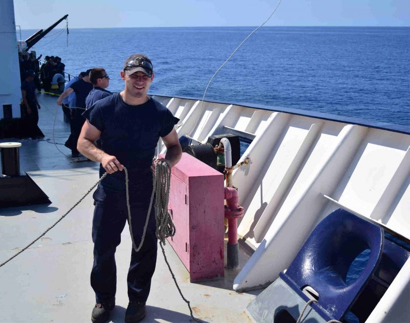 - 4/C Bennett practices throwing a heaving line while in deck training.
