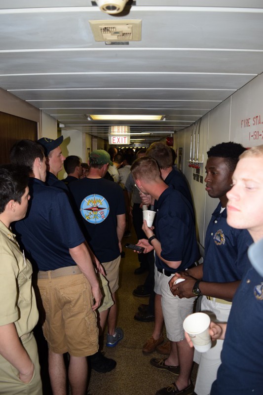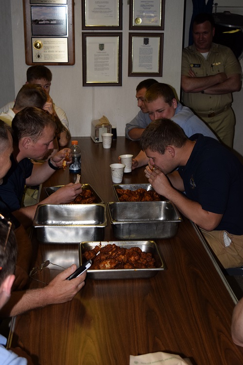 Can you say hot wings? The Sodexo cooks were at it deep into the night preparing chicken for the 2016 Summer Cruise Wing Eating Competition. Oh boy were they done right! A special thanks to Mr. Mark Strang for putting together another successful Wing Night and congratulations to MIDN Giguere for a successful bid for the 2016 Wing Champion.