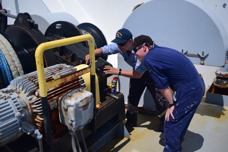 - 2/C Nichols and Graham work on the #3 winch coupling.