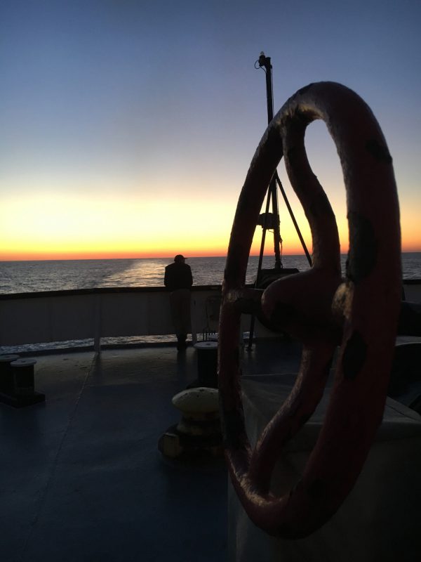 - 4/C Hallett is treated to a spectacular sunset while on stern lookout