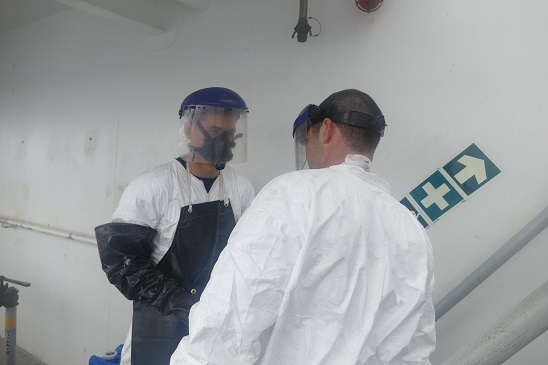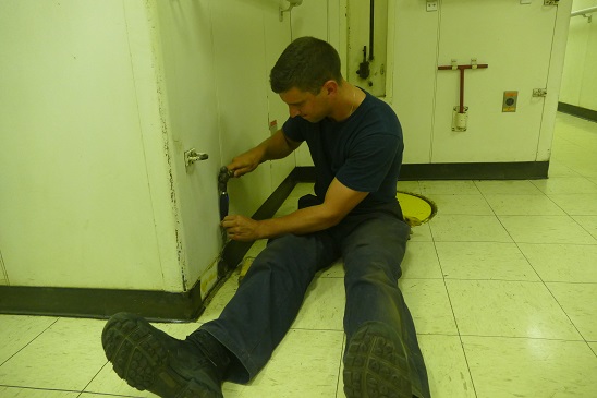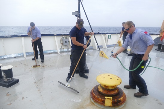 2/C Gamache teaching 4/C York, Hatch and Hemmerlein how to clean the fantail in preparation of painting later on this week.