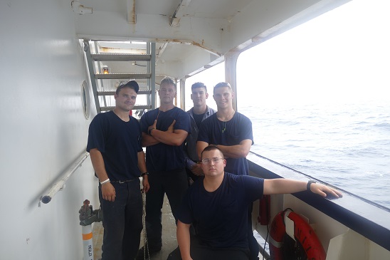 We are 2 days into our journey back across the ocean. Most everyone has enjoyed seeing their families and friends in Portland; a nice respite from being at sea. There was a nice welcome for the 2/C that came on, and fond farewells were bid to the 2/C that were going off. As for now, it’s back to business as usual as we head to Europe. Delta is on Utility, Charlie is on Watch, Bravo is on Maintenance, and Alpha is in Training. Here are some fun photos of the cadets cleaning mop heads this afternoon.