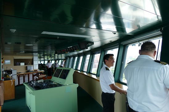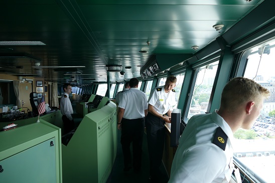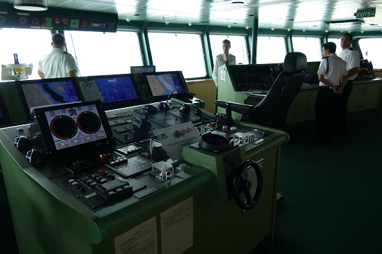 - The wheel on the bridge, as well as a number of the different consoles. On the left is CSO Pilbey, to his left is the Officer on Watch (2nd Mate), and then we see 4/C Adam Casillas and 4/C Robert Pfeiff. Photo Credit: D Silver