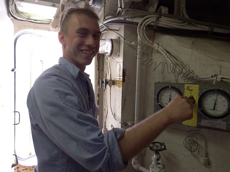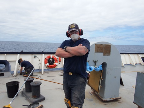 4/C James Gillway triumphantly preparing a section of the Fantail for painting.