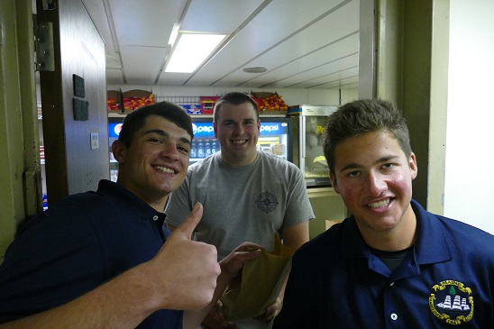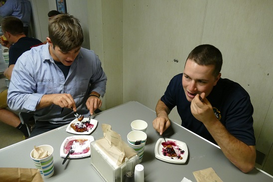 4/C Matt Reed and 4/C Rory McMahon enjoying the popcorn that 2/C Jackson Larrabee is doling out.