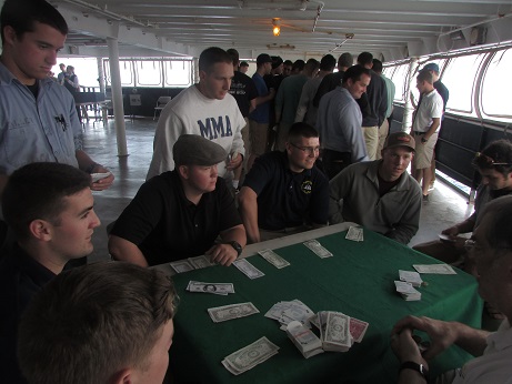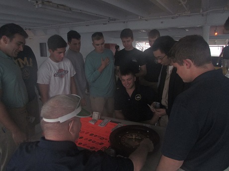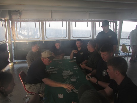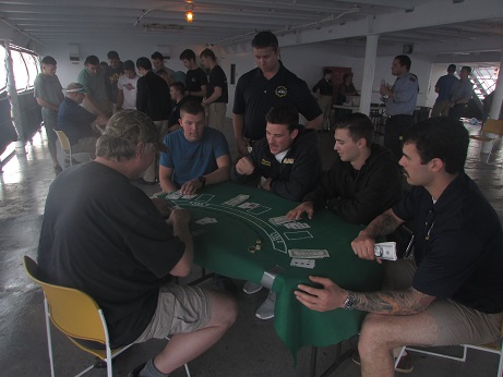 We are on our way back to the east coast of the United States. We are on the home stretch and all the companies are studying and preparing for their final tests and flashlights. Delta Company will be first to take their tests while Charlie Company is currently in the middle of their long stretch of watch. We took a break last night to spend some time together and practice our luck at Casino Night.