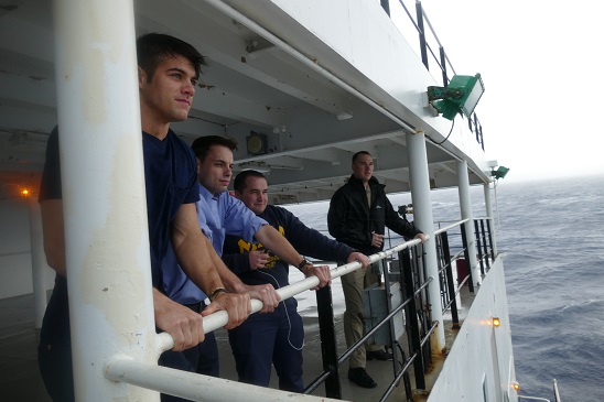 - Left to Right: 3/CDerek Breunig, 4/C Clinton Garrett, 3/C Jeff Franz, and 4/C Brendan Glass look out from the 03 Accomodation Deck as the ship steams through some rough seas.