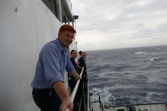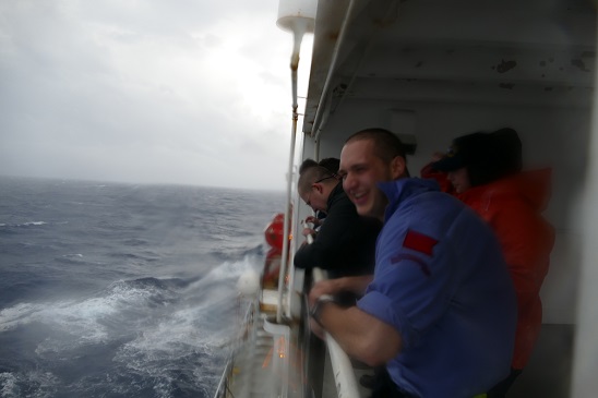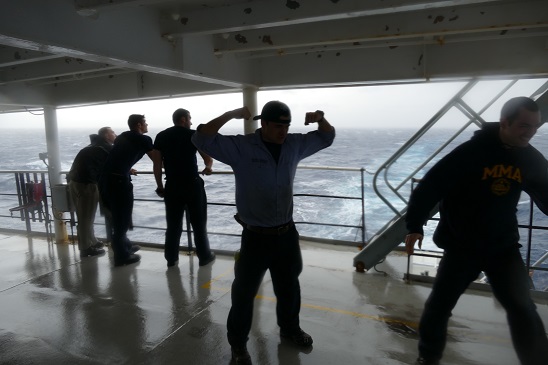 Day 9, and the ship is a day out of the first port call in Charleston. The weather has warmed up, and the ship is in the Gulf Stream. However, with the warmer weather comes higher seas and some rain and heavy wind. That doesn’t dampen the spirits of our intrepid students, who braved the weather to go outside and see the seas up close and in person.