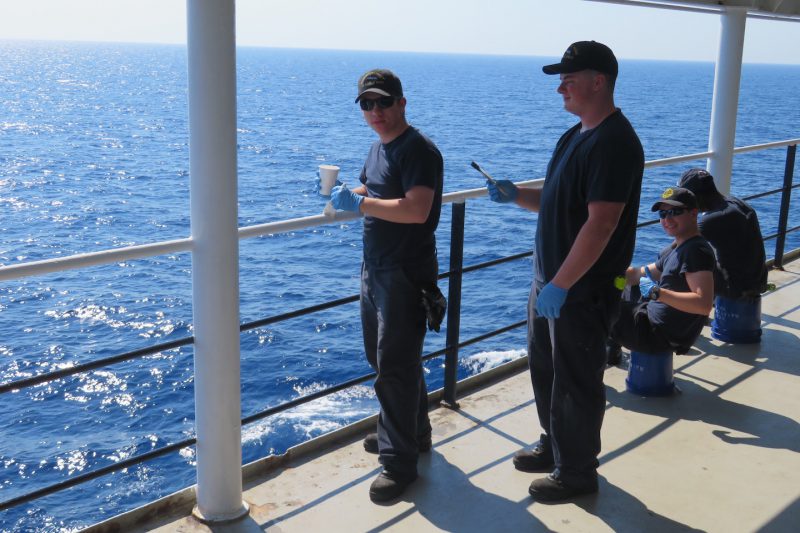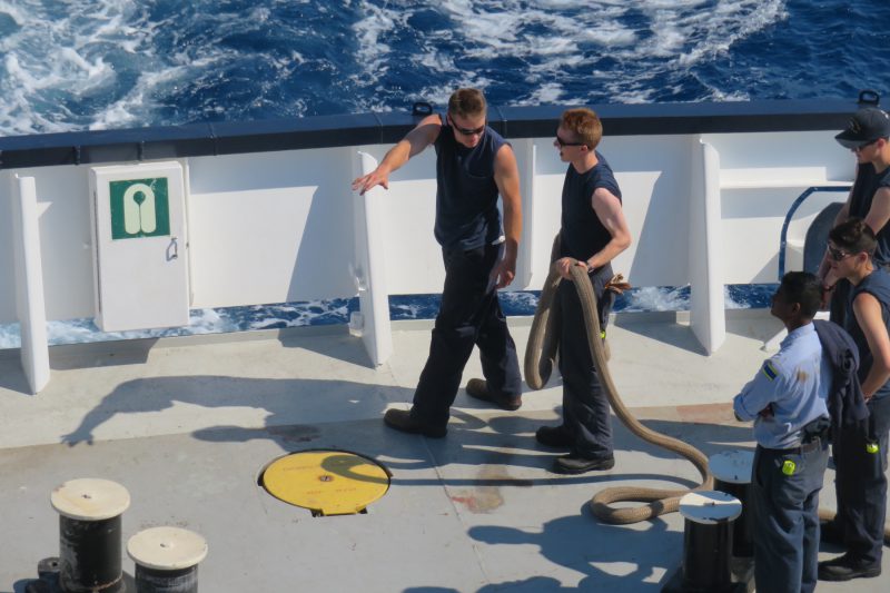 Alpha had the watch today navigating the ship off the coast of Corse. On maintenance today there was work on ship service diesel generator number 1 (SSDG1) which is one of 3 generators onboard. It was discovered late in the night that there was an air leak in one of the start air lines. Engine maintenance completed the fix and fired up the generator following. Deck maintenance continued work on repainting the bow and winches 1-3. Charlie company had utility today taking care of the freshly waxed floors done by student workers overnight. Delta Company had training and completed line handling part two including a tug boat skill (Pictured) known as “throwing the eye”. Countdown to Civitavecchia is only two days away!
