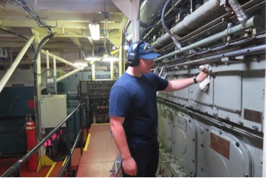 - 4/C Webb is on watch, wiping oil off of the main engine
