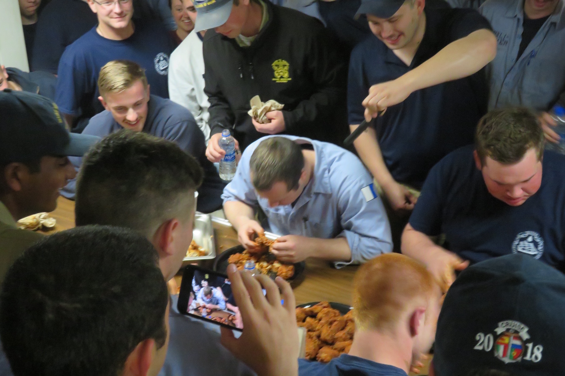 Today the weather was sunny and 70 degrees Fahrenheit. Alpha took the watch at 0000 this morning and is currently sailing 270 degrees following our planned route to arrive in Portugal. Work continued on the number 3 MSW pump in the engine room today with Bravo company taking over the project on maintenance. Bravo company also began chipping paint on the bow readying the deck for repainting as well as worked on priming and painting the winches on the bow. Charlie completed their testing in training today and Delta took care of the ships cleaning on utility. After working hard today a group of midshipmen all played corn hole up on the O4 and others socialized on the fantail enjoying the sun and warm weather. Tonight 2 people from each company faced off in a chicken wing eating competition. Congratulations to Charlie Company, our winners of the competition.