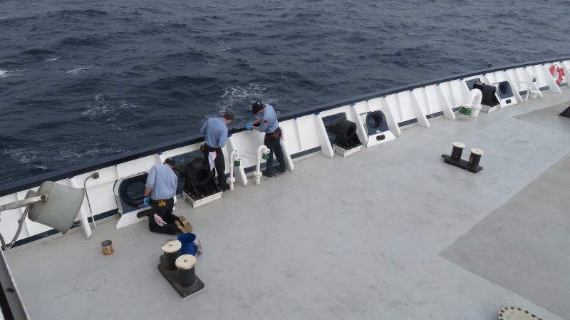 It’s been a busy day aboard TS State of Maine. The students are doing tasks to keep the ship in great shape. Bravo Company continues maintenance in both the engine room and on the deck. Students in the engine room are working on fixing main sea water pump number 3 (MSW3) which is one of the pumps that keeps various machinery around the engine room cool. On deck, there are students working on the number 1 lifeboat engine. Charlie company recovers from their two days on watch by cleaning the ship and carrying out utility tasks throughout the ship. Alpha company is completing their deck and engine tests today. They are spending the time after their morning exam to study for the afternoon exam. Alpha company will assume the watch tomorrow until our arrival in three days to Lisbon, which marks the middle of cruise for 4/C and the end of cruise for some 2/C midshipmen. The juniors from cruise A will be switching out with cruise B juniors.
