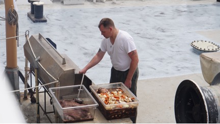 - Our Chief Steward, Mark Strang, preparing the main course for our delicious barbecue meal