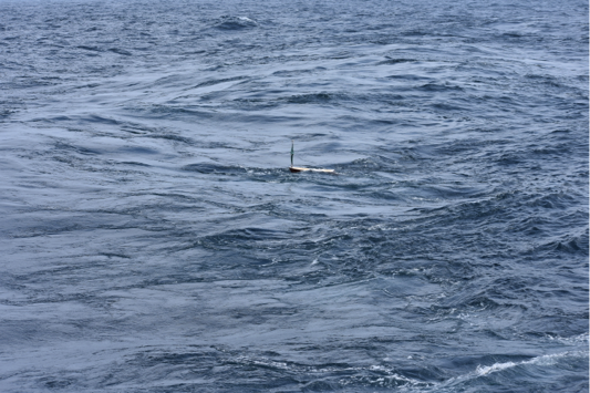 - Red Storm mini research vessel at sea.