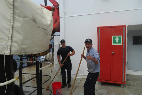 - 2/C Curzake and 4/C Moulton are working hard together to clean around one of the ship’s cranes.