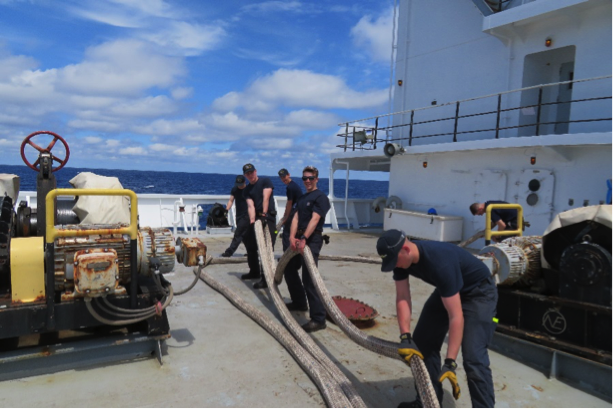 - 2/C Broderick, 4/C Merritt, 4/C Cameron Smith, 4/C McClain, and 4/C Sattler prep line for stowage
