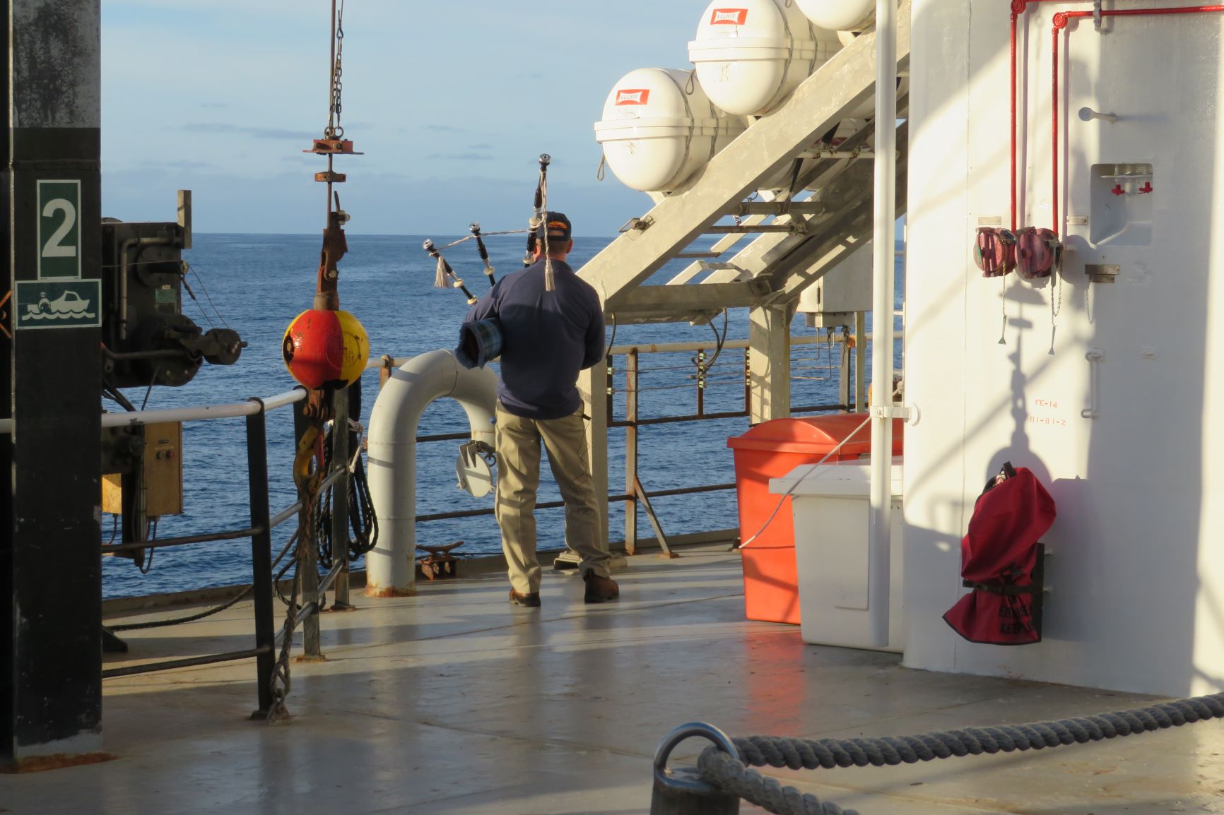 - LT Snow played his bagpipes on the hatch-square this evening.