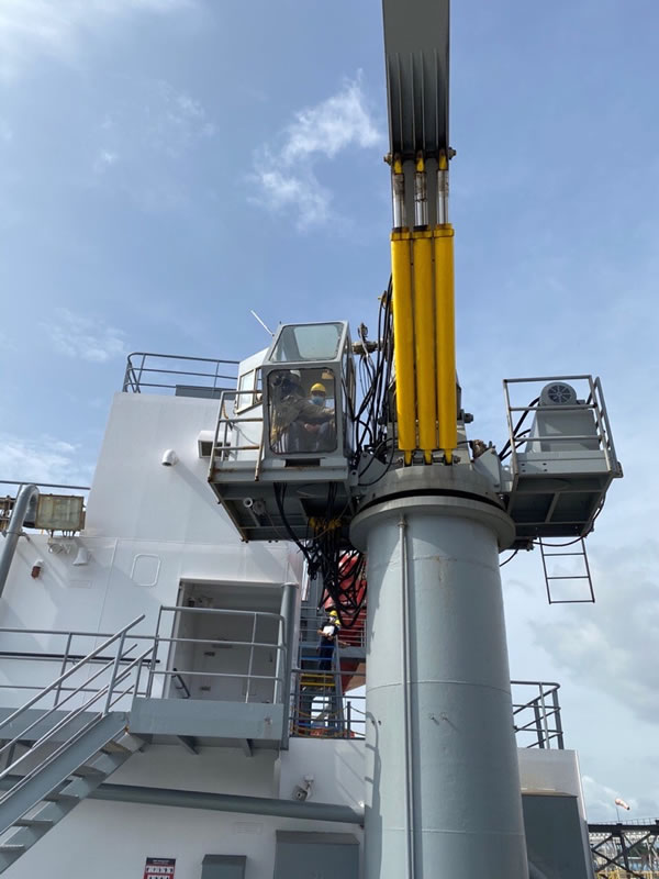 - MIDN Robert Pfeiff in the crane cab, practicing the crane to better understand it’s operations.