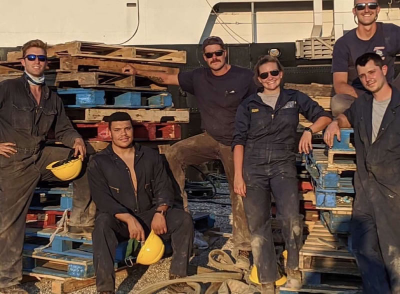 - Our dockside crew. From Maine Maritime we have MIDN Shea Donnelly (center) and MIDN Charles Doughty (right), working alongside cadets from Kings Point and California Maritime.