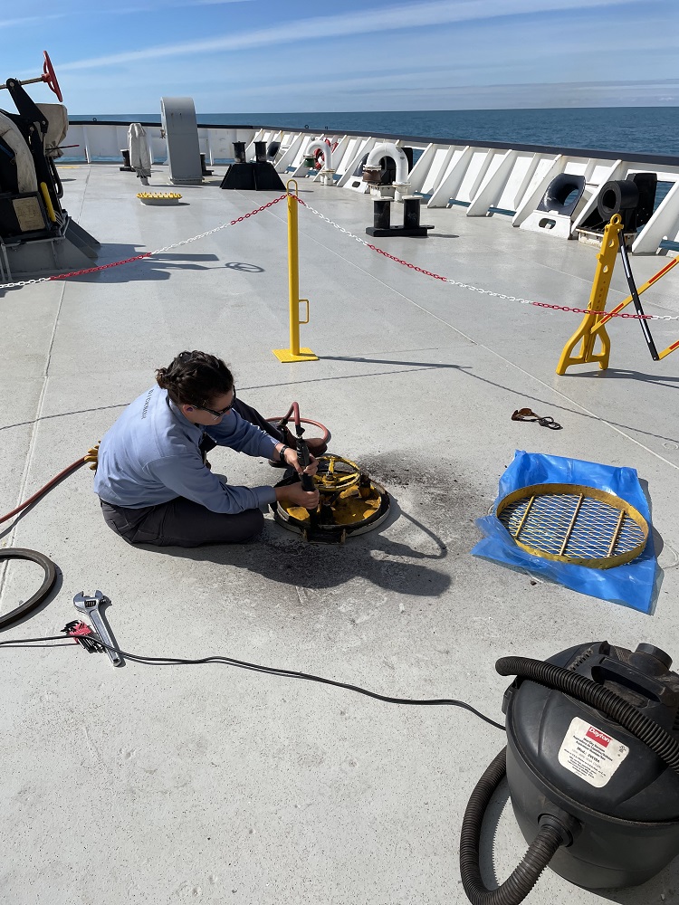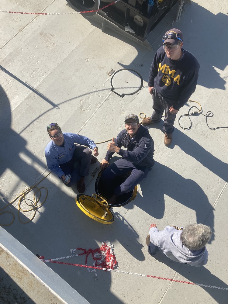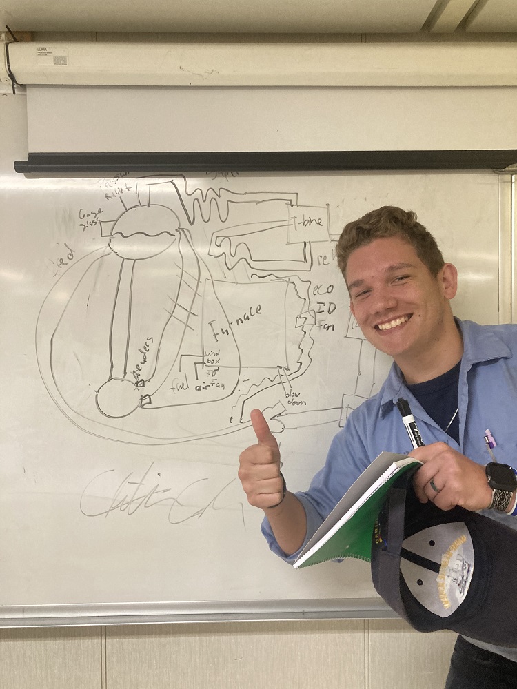 With flashlights over, Bravo Company’s engineers have moved on to learning about steam generators. Delta Company is on maintenance today, with some of the deck cadets working on needle gunning paint and rust off a scuttle hatch so it can be repaired.