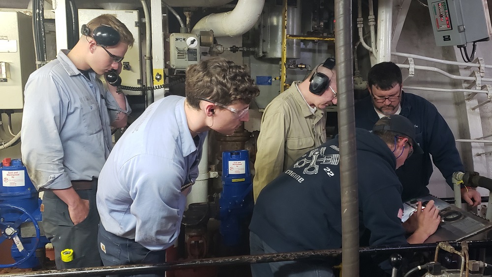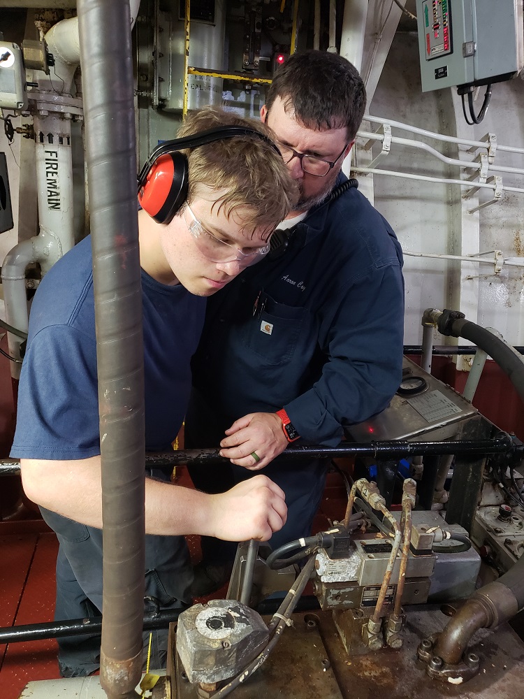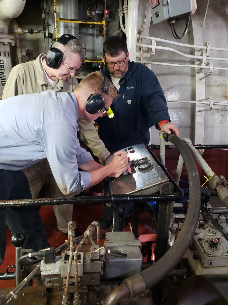 Junior engineers practicing with controllable pitch propeller (CPP) local control! The TSSOM’s propeller has controllable pitch, which is used to slow down and reverse.