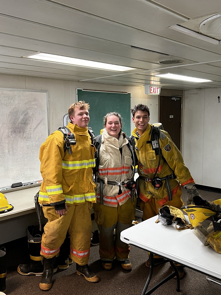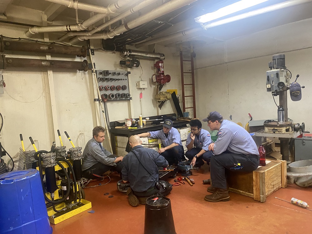 Recently, deck students had firefighting training. All the 4/C Deck students had to suit up in firefighting gear and crawl around blindfolded to rescue a dummy. Also pictured above is an average day in the machine shop.
