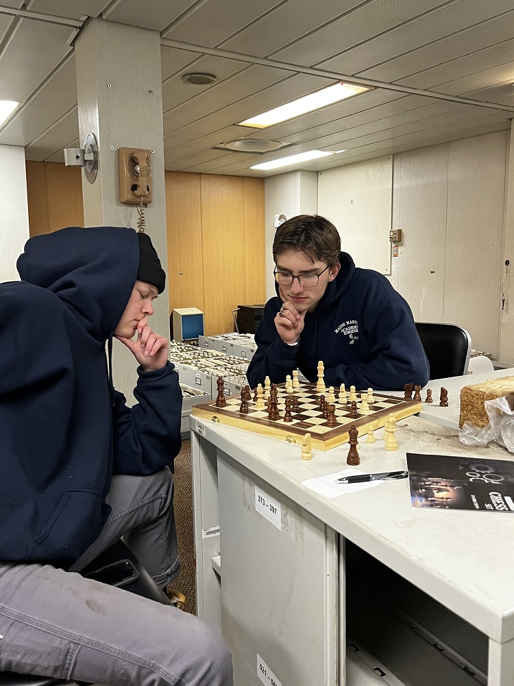 - Chess has become a favorite pastime of many on the ship! 4/C Behan and 4/C Murphy pose for a picture while playing against each other.