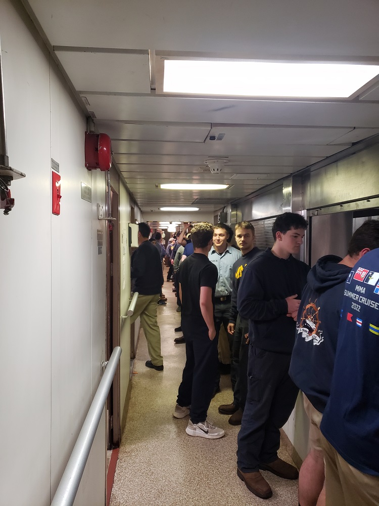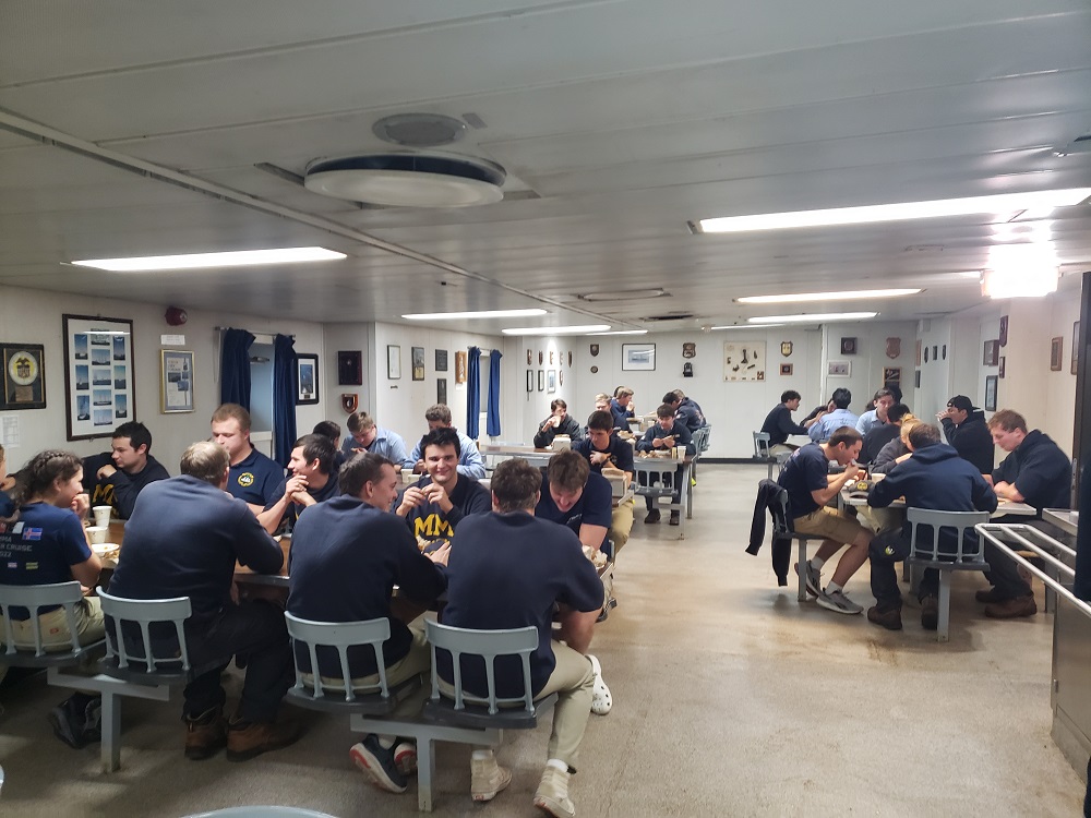 Today was Pete Johnson’s birthday! To celebrate his 80+ years, students gathered in the forward mess this morning and wished him a happy birthday. Later in the day, we had a fire and emergency drill to simulate a fire in the freshman berthing computer lounge, one of our biggest drills yet. Emergency squad communicated well and worked together to put the mock fire out.