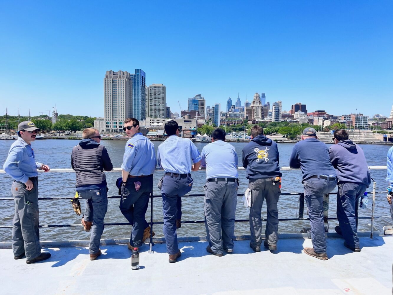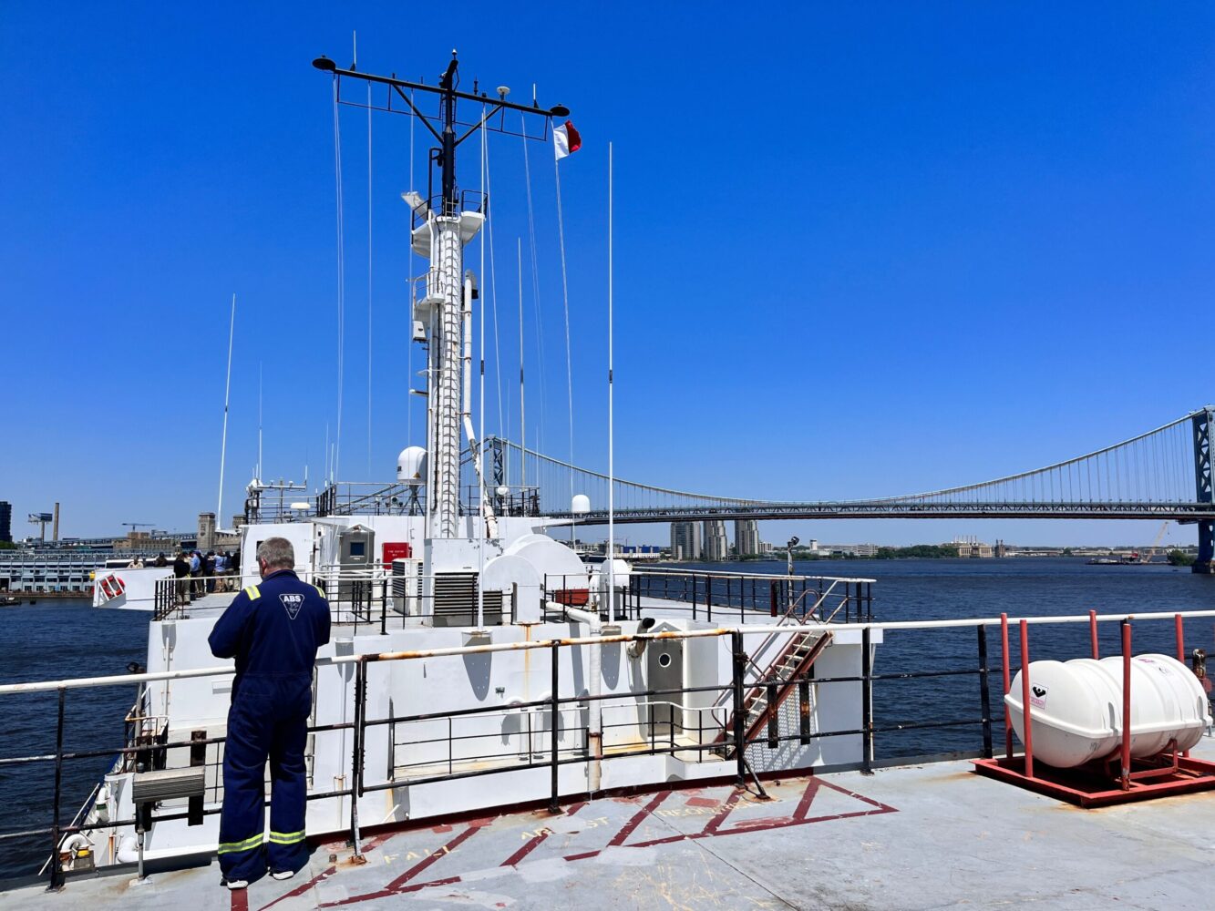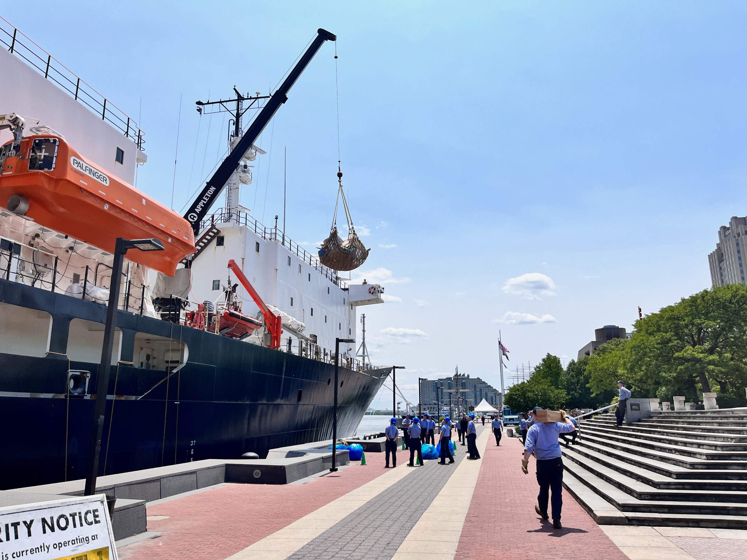 On liberty, students, staff, and crew got a chance to stretch their legs and stock up on snacks for the longer voyage coming up. Our berth in the heart of Philly was directly adjacent to a park with an amphitheater. Students stand a “pier security” watch to make sure that only approved visitors and technicians visit the vessel. While ship tours can be arranged in our home port of Castine, with all the busy students and crew working full days, the ship is not open to the public during port visits. Nevertheless, students on the pier got a healthy dose of community relations while regulating who was supposed to be on the TSSOM and who was not.