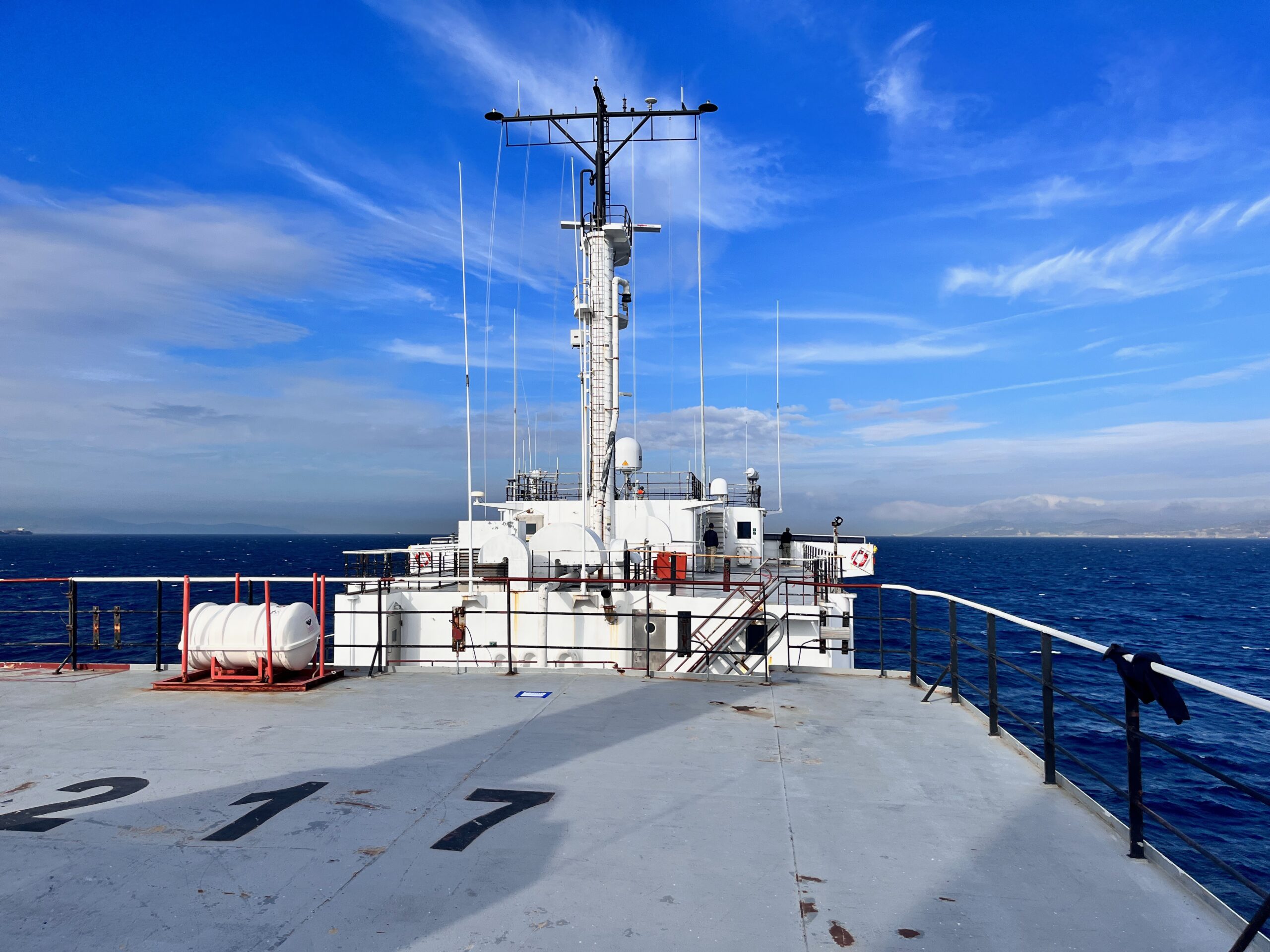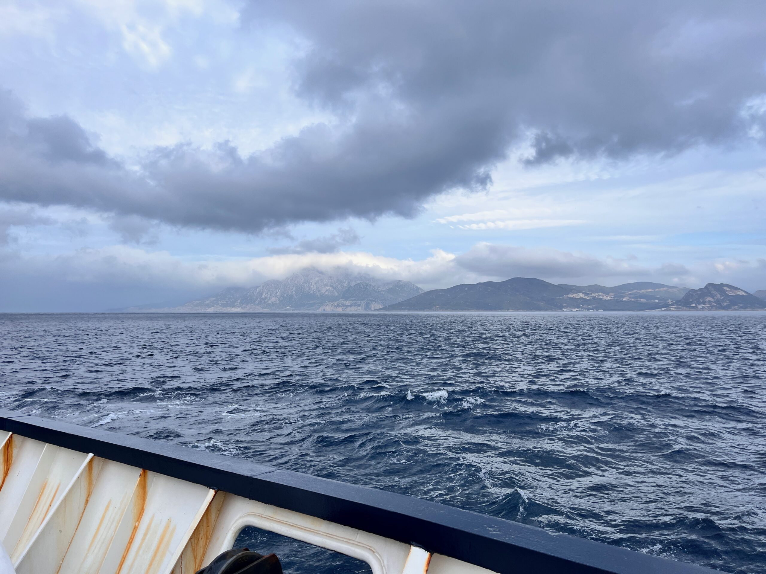 Good Afternoon! We passed through the Straights of Gibraltar last night. The whole experience was completely surreal. On our starboard side was Morocco and the rest of Africa, and on our port was Spain and the rest of Europe! I spent my free time in between activities yesterday, enjoying the warm Mediterranean breeze. In the morning, I was on deck maintenance with the Bosun. Two juniors, another freshman, and myself were tasked with starting the engines on the two RHIBS and all four lifeboats. This job must be done once a week. The lifeboats feel roomy when it is just three people, but they are rated to fit 70 or 90 people. Starting the lifeboats is not difficult; batteries on, switch to “run,” start, then throttle ahead and astern, and you are done. The lifeboats use coolant to cool the inboard diesel engine so we can safely exercise it for about three minutes before it gets too hot. The RHIBs are more complicated as they require us to technically work over the side, even though we are not hanging off the side of the ship, which requires fall prevention harnesses. We run a garden hose to supply water to the engine and let it run for a bit to charge up the batteries. After we finished the job, we were cut for lunch. After lunch, we had a Man Overboard drill, in which everyone musters at their station and we establish who is missing. Boat squad swings a RHIB alongside in preparation to begin search and rescue. It is dangerous to bring such a small boat back to the ship, so Boat Squad stops the simulation there. (as pictured)