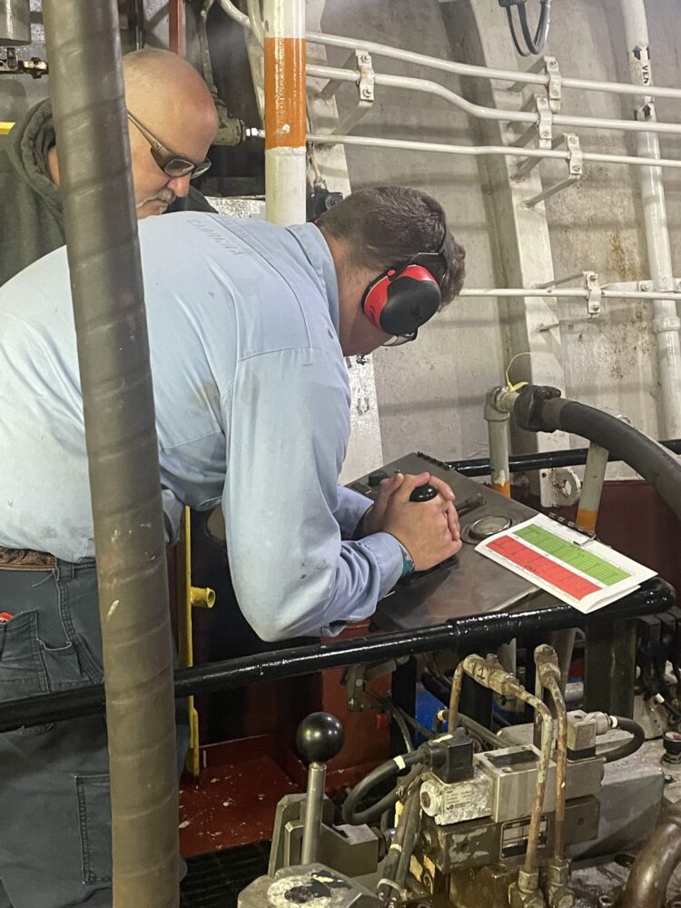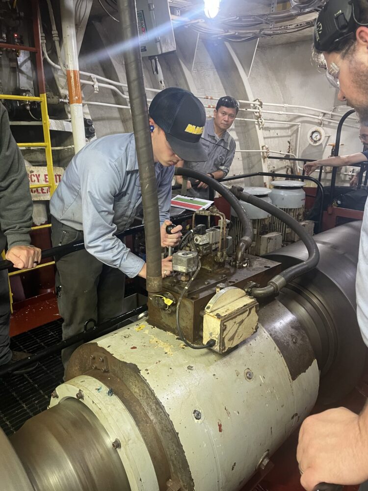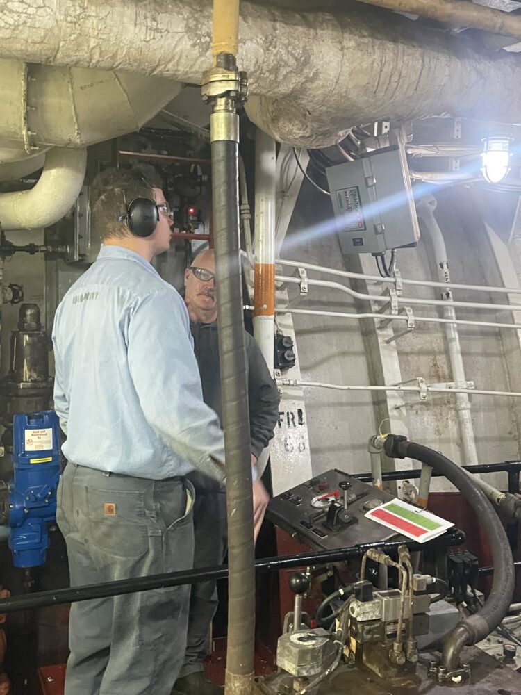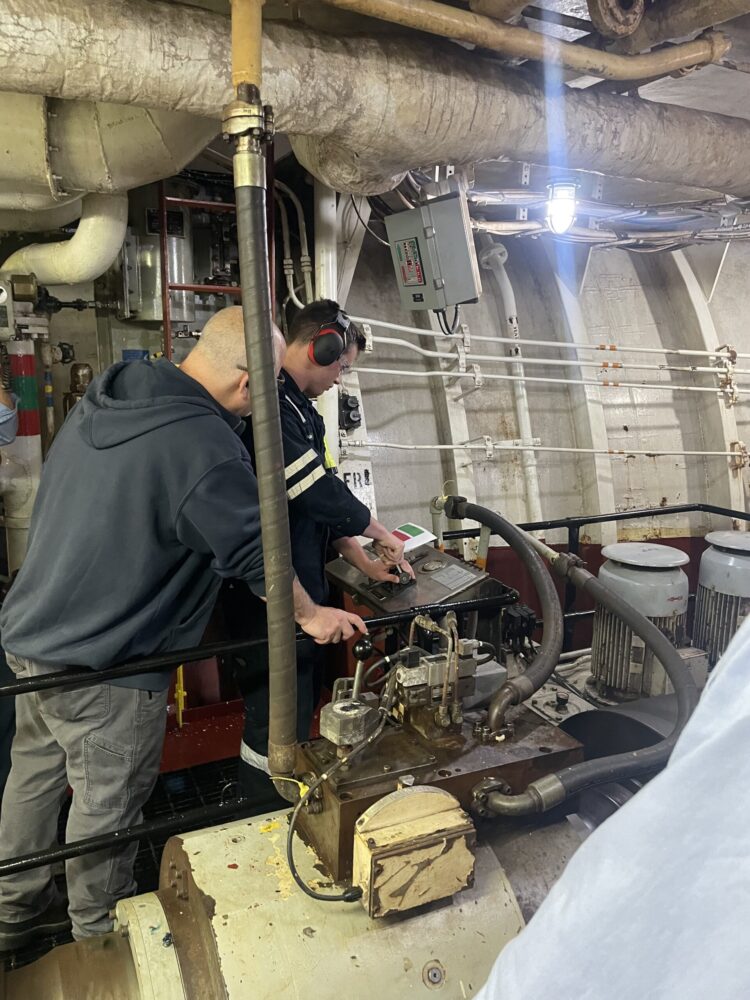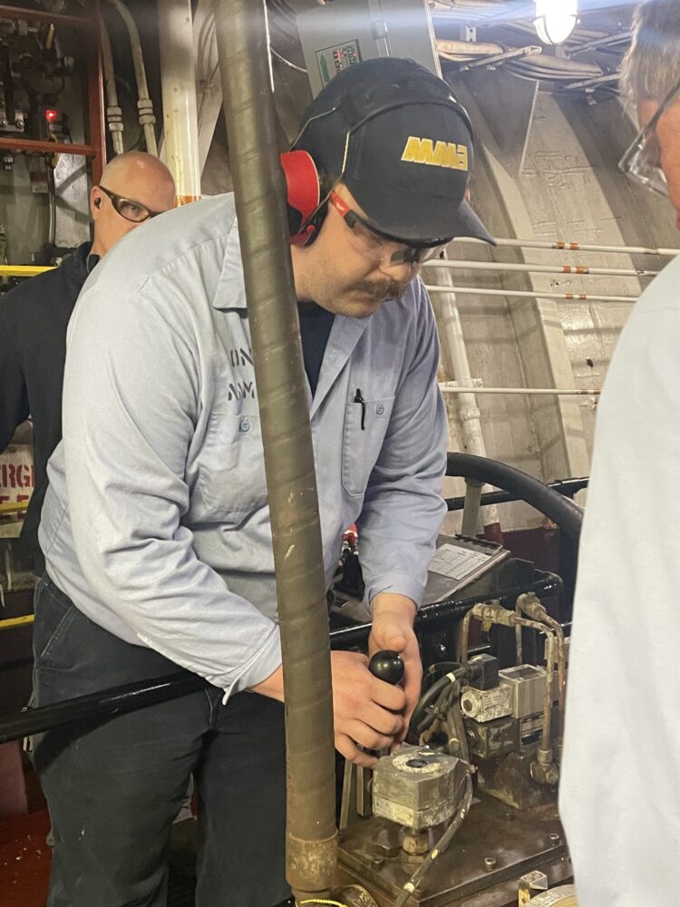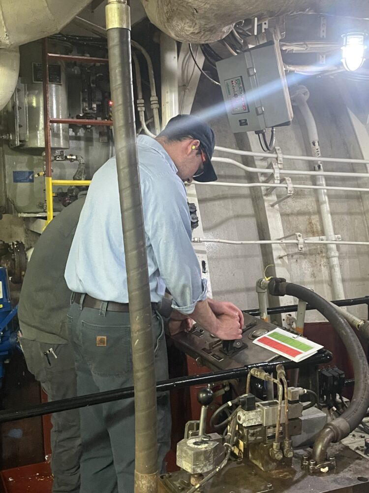 Power Point lectures can only take you so far. To supplement the learnings of the lecture, the students were given permission by the Captain/Master Gordon “Mac” McArthur and Chief Engineer Aaron Coy to display their learnings and take control of the Main Engine RPM and Controllable Pitch Propeller System, locally in “Shaft Alley”. The students were then “given bells” (change in speed requests from the bridge). Each student had to acknowledge the bells, and then make the appropriate engine RPM and Controllable Pitch propeller movements locally to change the vessel speed across the water.