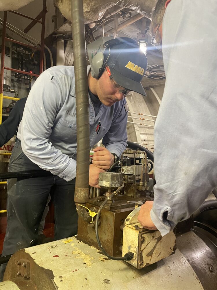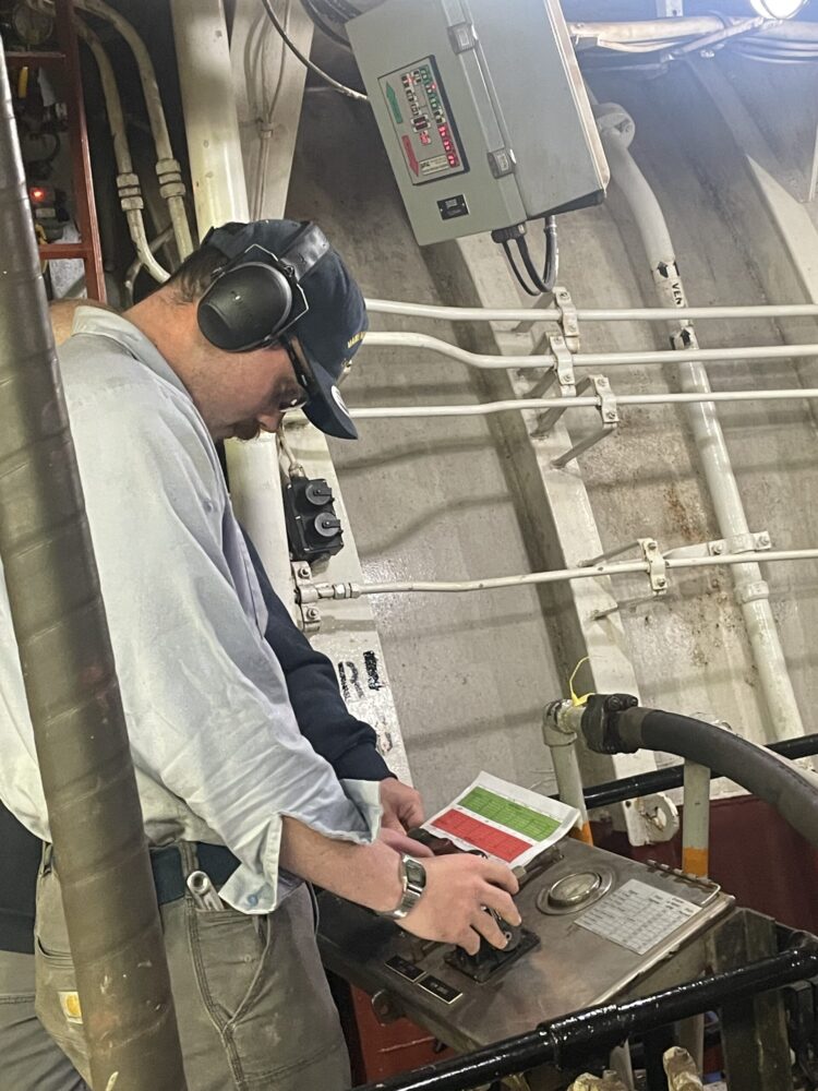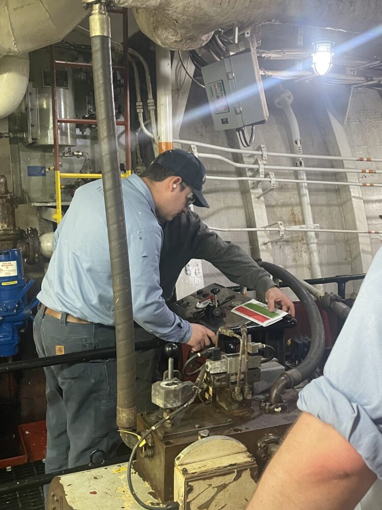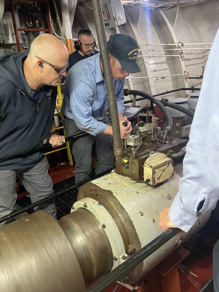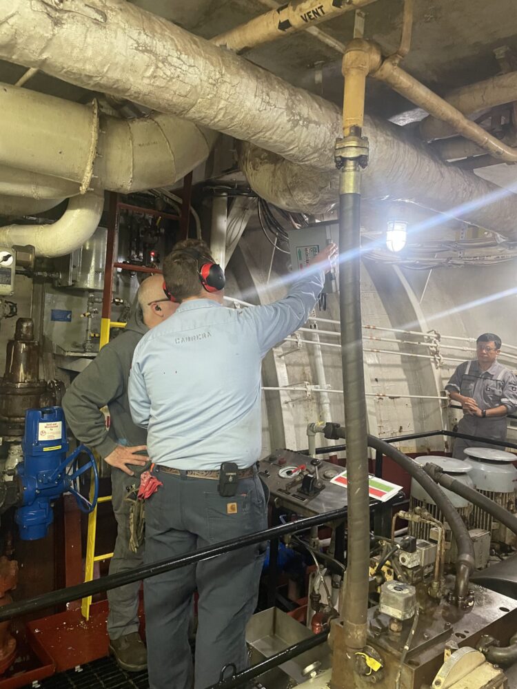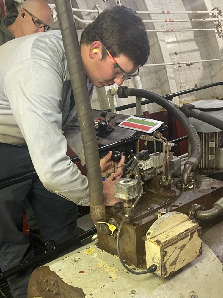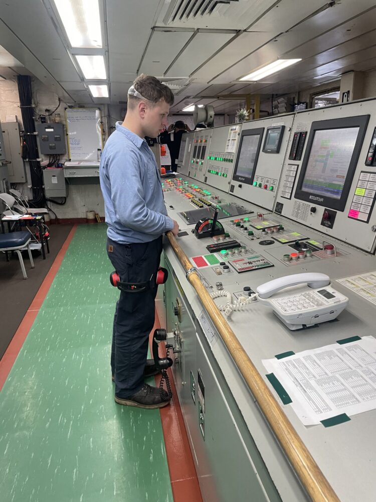 Power Point lectures can only take you so far. To supplement the learnings of the lecture, the students were given permission by the Captain/Master Gordon “Mac” McArthur and Chief Engineer Aaron Coy to display their learnings and take control of the Main Engine RPM and Controllable Pitch Propeller System, locally in “Shaft Alley”. The students were then “given bells” (change in speed requests from the bridge). Each student had to acknowledge the bells, and then make the appropriate engine RPM and Controllable Pitch propeller movements locally to change the vessel speed across the water.