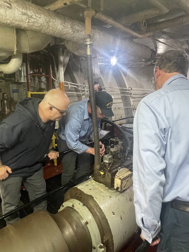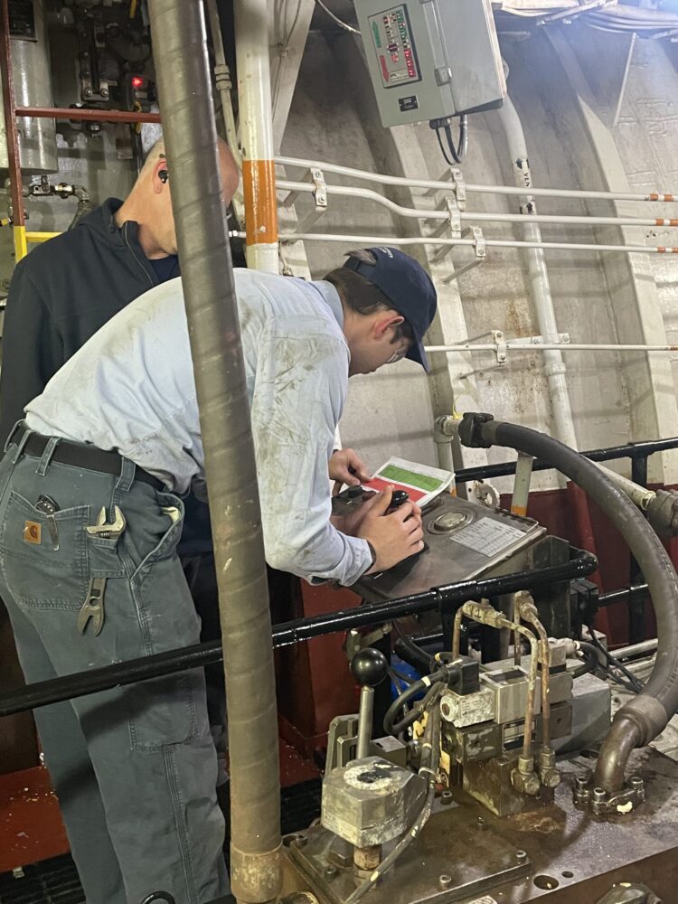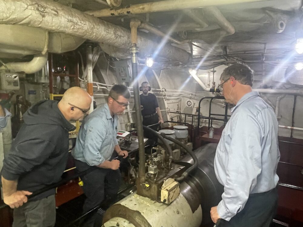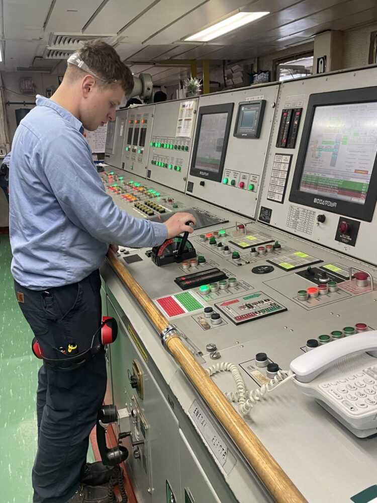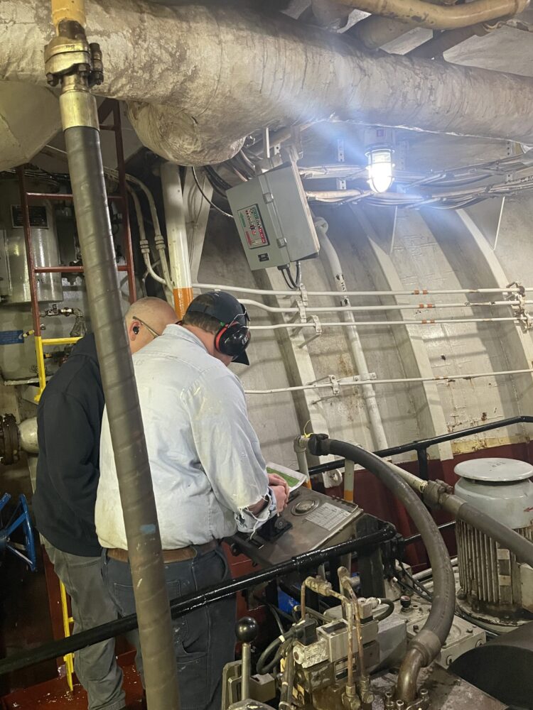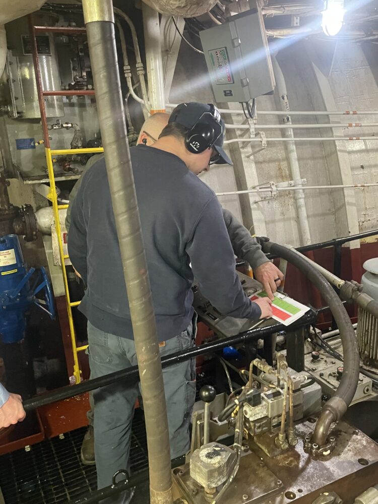 Power Point lectures can only take you so far. To supplement the learnings of the lecture, the students were given permission by the Captain/Master Gordon “Mac” McArthur and Chief Engineer Aaron Coy to display their learnings and take control of the Main Engine RPM and Controllable Pitch Propeller System, locally in “Shaft Alley”. The students were then “given bells” (change in speed requests from the bridge). Each student had to acknowledge the bells, and then make the appropriate engine RPM and Controllable Pitch propeller movements locally to change the vessel speed across the water.