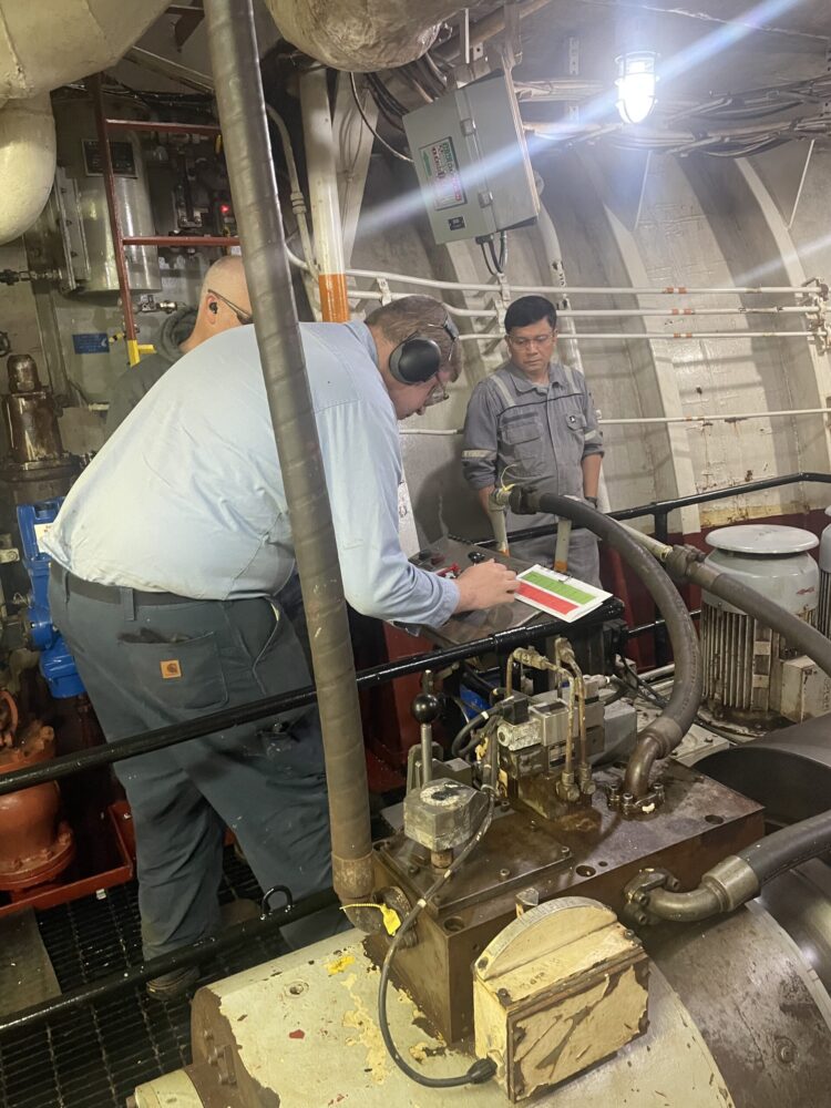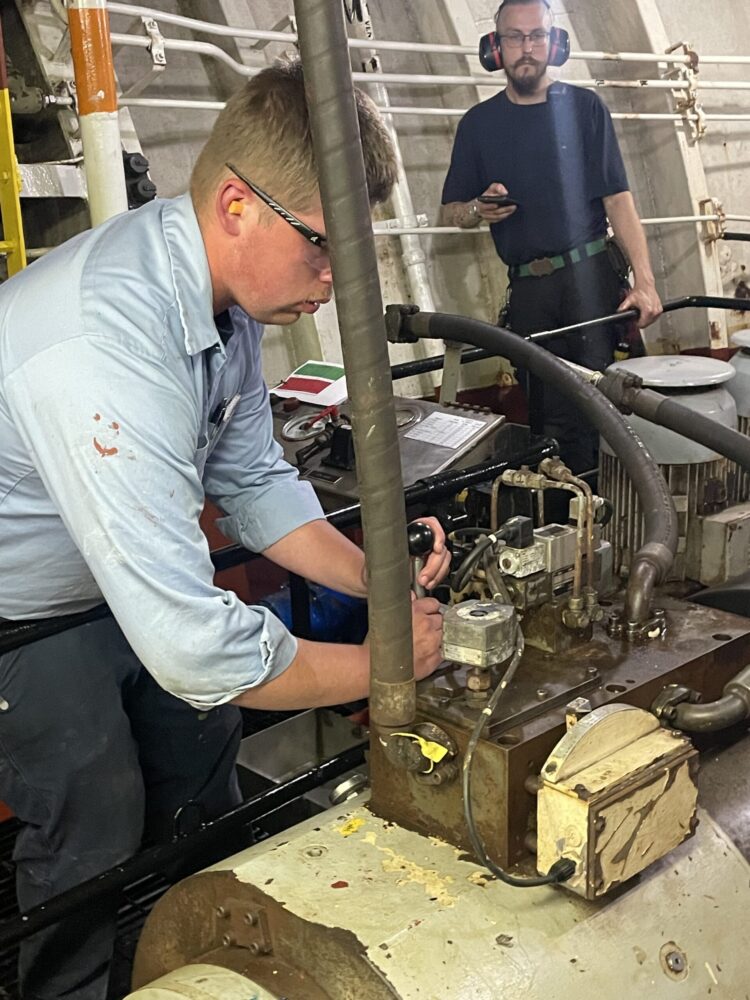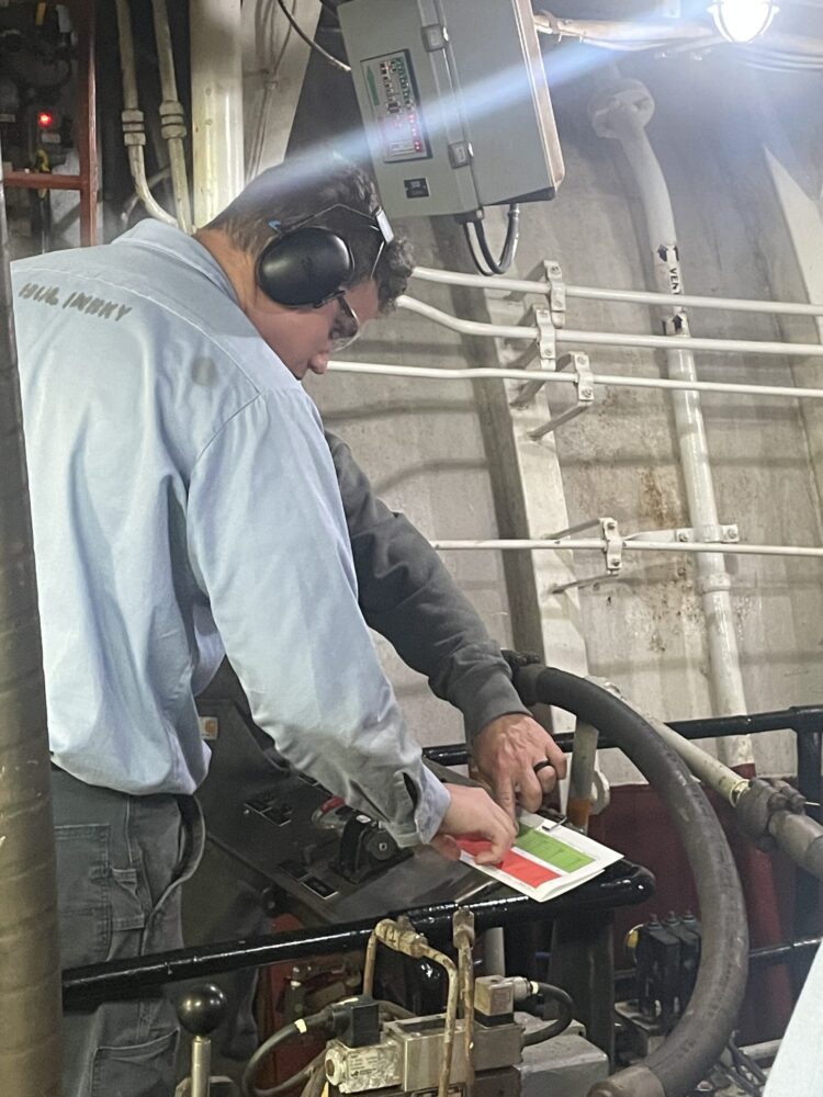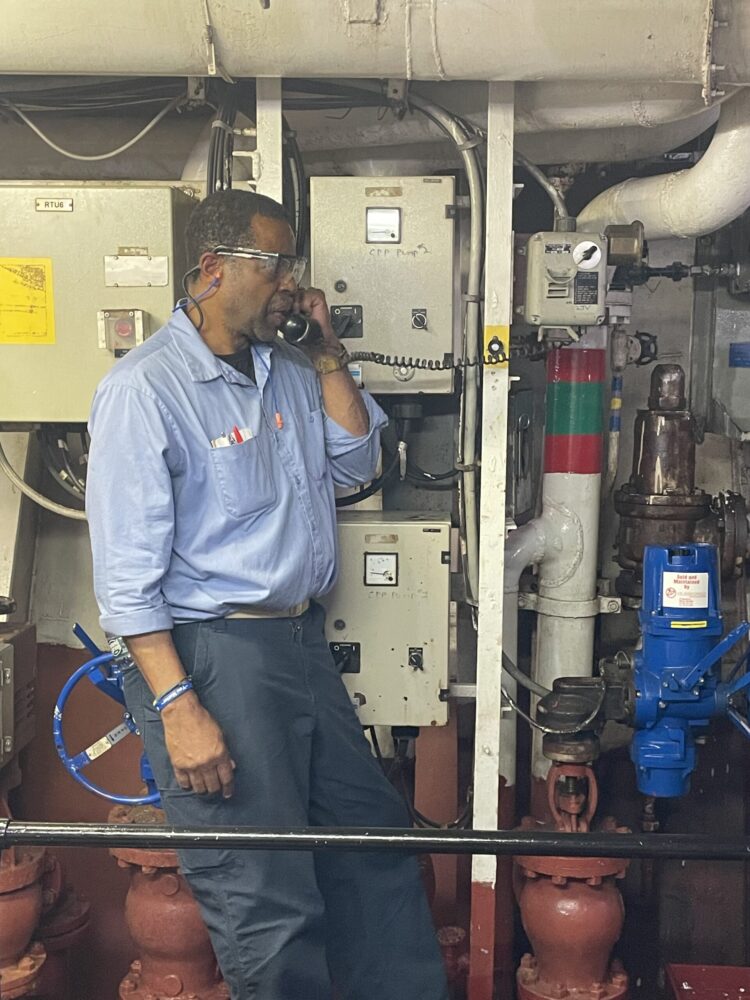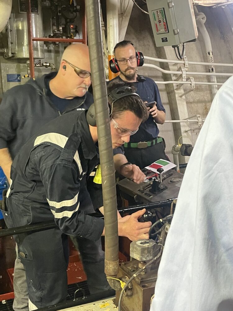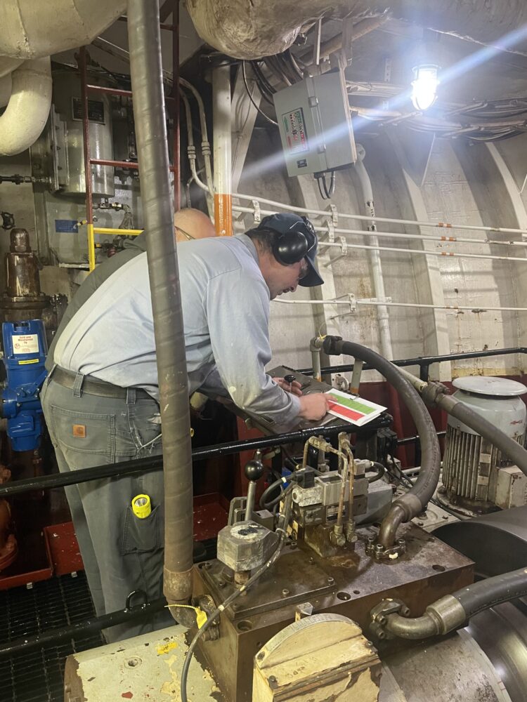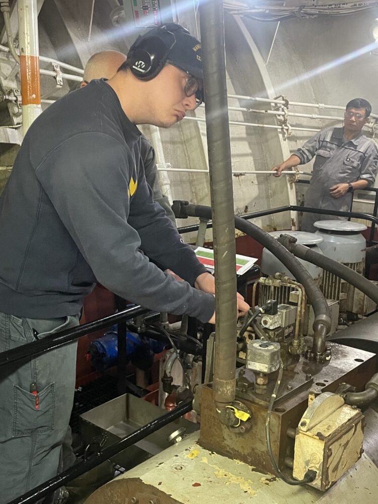 Power Point lectures can only take you so far. To supplement the learnings of the lecture, the students were given permission by the Captain/Master Gordon “Mac” McArthur and Chief Engineer Aaron Coy to display their learnings and take control of the Main Engine RPM and Controllable Pitch Propeller System, locally in “Shaft Alley”. The students were then “given bells” (change in speed requests from the bridge). Each student had to acknowledge the bells, and then make the appropriate engine RPM and Controllable Pitch propeller movements locally to change the vessel speed across the water.