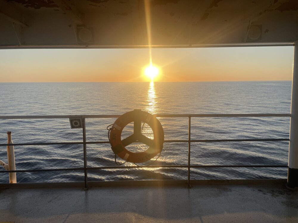 We’re well beyond sight of land by now, but a few birds still stray out this way, and earlier this morning, a little butterfly made its way towards us, flitted around our heads for a few moments, and was on its merry way. As I write this, I’m in awe of the simple beauty around us. The sky has taken on the pale pastel beginnings of sunset, and the sea has almost a silver tone. Mare’s tails (a sort of cirrus cloud that usually foretells rain and wind) and contrails dot the sky. Being underway is an incredible feeling, and spirits are high. I think we’re all ready for our grand adventure, and we’re truly a lucky few to be able to experience this.