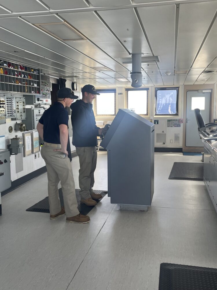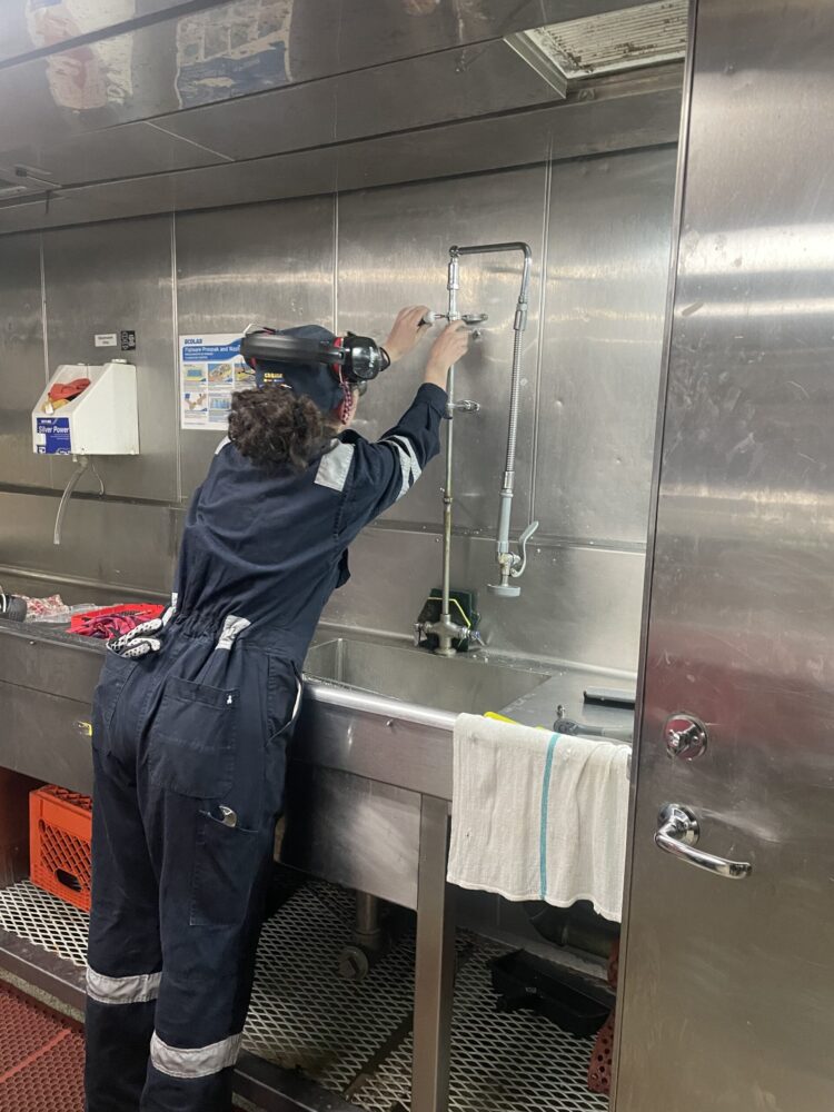 Of course, there’s time for fun, too. We’ve had several whale sightings already, including a National Geographic-worthy scene where a whale breached at the same time as two dolphins. The fantail, 03, and 04 decks bustle with activity as cadets and staff alike enjoy the weather – there’s a few games of cornhole going, some folks are fishing, and I’ve been enjoying painting, practicing with my new gouache paints. The night before, I was lucky enough to follow a number of upperclassmen up to the bridge for celestial navigation practice. We took an amplitude of the sun, and azimuths of stars, in order to cross-check our gyro compass and position.