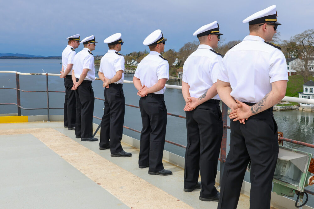 The rain held off just long enough for us to get underway. At 1030 Bravo Company and Alpha 4/C (freshmen) dressed in salt-and-pepper uniforms and lined the rails of the 04-deck aft house. Onshore family, friends, towns people, and the Adam’s School gathered with signs and streamers to wish us farewell. The tugs arrived from Belfast and after President Jerry Paul, Commandant Captain Mark Winter, and Castine Selectman Gordan MacArthur made speech’s, the gangway was lowered, lines were cast, and the Training Ship State of Maine left Castine for the last time.