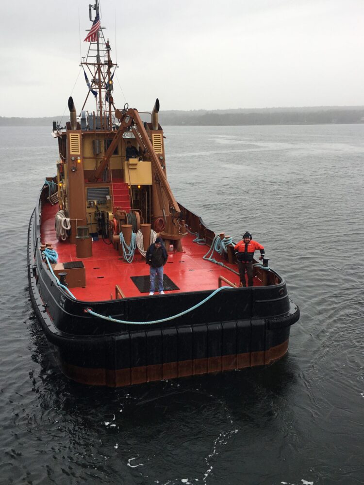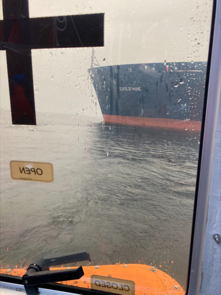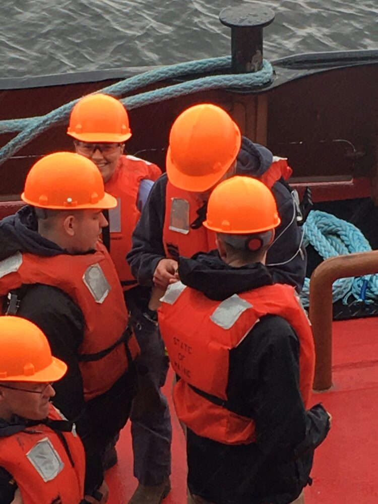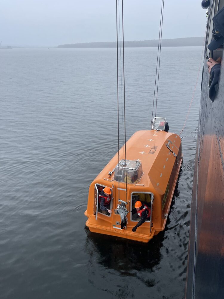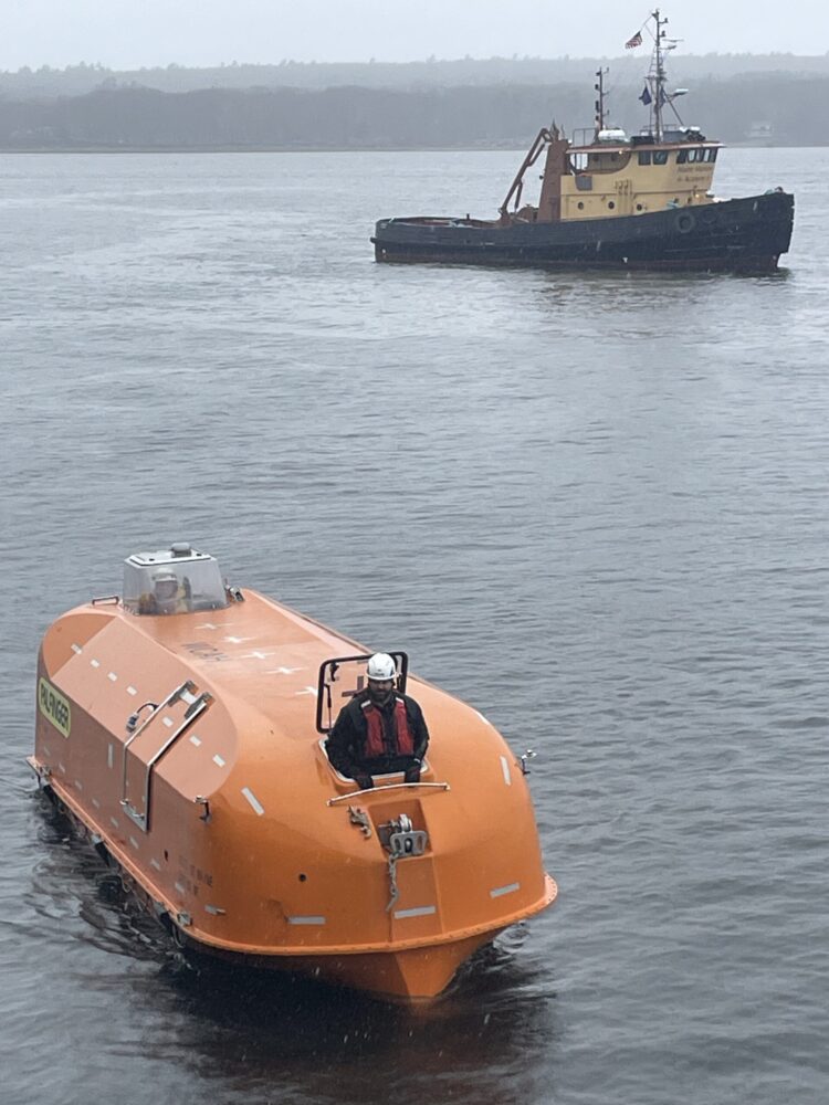 We pulled out of the harbor flying the Hotel flag to signify we had a pilot onboard, and waved one last goodbye to the Castine Fire Department’s siren and hose send-off. Below-decks things quickly returned to normal with lunch, classes, maintenance, and utility projects. Once anchored at Turtle’s Head, Boat Squad was called to start Coast Guard testing and inspections. Lifeboat 2 was lowered with crew aboard and performed some maneuvers before reattaching to the davits and getting hauled back aboard. TSSOM is equipped with four gravity powered lifeboats that can hold a total of 320 people, more than enough for the 248 we currently carry. These lifeboats are designed to go down well but cannot be lifted while loaded, so Boat Squad, the Boson, and Chief Mate were retrieved by our own tug Pentagoet, driven by Captain Derek Chase, and reboarded from the stern. Coast Guard inspections will continue tomorrow, and if all goes well we will depart for New York in the afternoon.